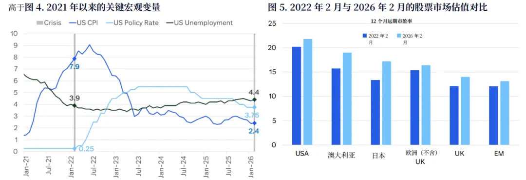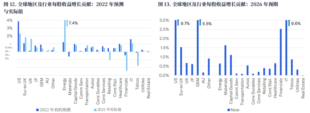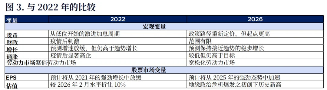 2022 年与当今对比 —我们将当前的宏观/基本面背景与 2022 年进行比较,以评估过往应对手册的适用性。2022 年虽面临大宗商品供应冲击,但央行政策更为宽松(为加息奠定基础),且家庭资产负债表可能更为强劲(得益于疫情期间的财政措施)。在乌克兰局势升级前,全球股票估值比伊朗局势升级前便宜约 10%;进入 2022 年时,全球每股收益增长预计将放缓,而2026 年预期每股收益则将加速增长。