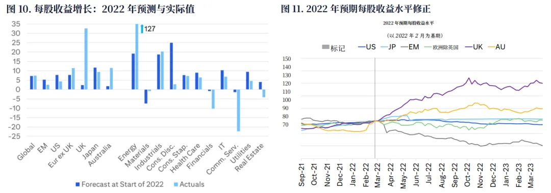 2022 年的盈利故事也值得关注,企业利润在总体层面上展现出韧性。尽管面临巨大的宏观冲击,全球每股收益增长最终与危机前分析师的预测非常接近(图 10)。深入来看,这之所以成为可能,是因为能源行业每股收益的大幅上调在很大程度上抵消了其他领域的下调。从绝对水平来看,新兴市场对 2022 年预期每股收益的下调幅度最大,而英国和澳大利亚则出现了明确的上调(图 11)。
