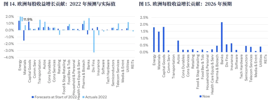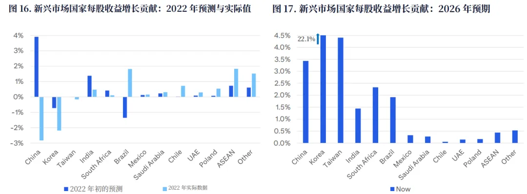 “增长构成”动态的转变是 2022 年的关键,此次也可能同样重要。我们在图 12、14 和 16 中突出了 2022 年每股收益增长的预测贡献与实际贡献。如上所述,能源板块最终构成了 2022 年每股收益增长的很大一部分,而金融板块则形成了明显的拖累。广义欧洲(英国 + 欧洲大陆)在 2022 年实现的每股收益增长最终超过了美国(图 12)。在新兴市场,巴西的贡献最终抵消了亚洲同行带来的拖累。