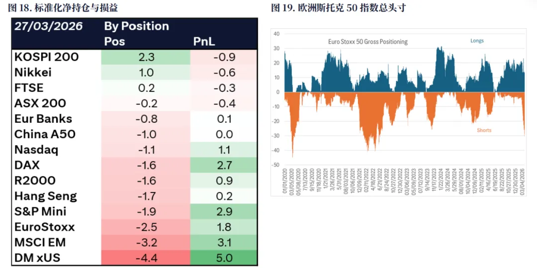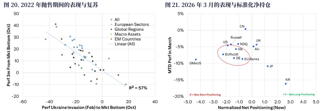 如果局势迅速得到解决,我们仍可能回归更具顺周期性的价格走势。图 20 和图 22表明,复苏期间最强劲的价格走势应来自跌幅最大的市场部分。图 21 展示了自 3 月初以来主要区域的表现与当前仓位配置的对比。跌幅最大且看空仓位最重的市场,不仅更能抵御下行风险,而且在复苏中也可能反弹更强劲(欧洲斯托克 50 指数和发达市场(不含美国))。尽管日本和韩国抛售幅度更大,但仓位配置尚未完全重置,仍维持一定的净多头状态。