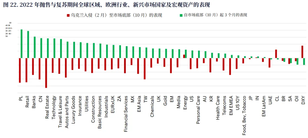 2022年的经验教训:表现方面—从区域来看,在2022年2月至10月的最初抛售中,没有哪个地区成为赢家;以美元计价,美国、英国和澳大利亚表现相对较好,而新兴市场以及欧洲(不含英国)表现落后。能源板块以及部分防御性行业表现突出。与大宗商品相关的新兴市场国家的表现超过了亚洲同行。美元被证明是明显的赢家,而债券和黄金则表现疲软