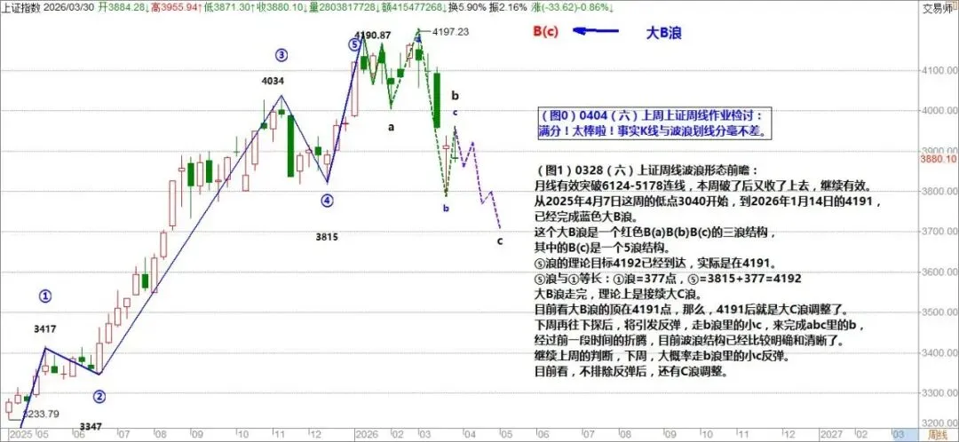从2025年4月7日这周的低点3040开始,到2026年1月14日的4191,已经完成蓝色大B浪。这个大B浪是一个红色B(a)B(b)B(c)的三浪结构,其中的B(c)是一个5浪结构。