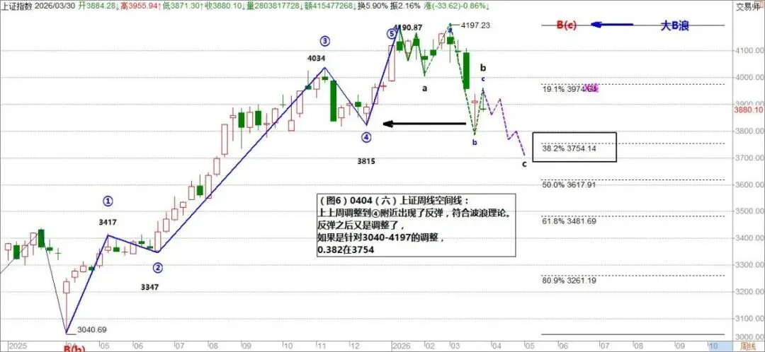 如果是针对3040-4197的调整,0.382在3754