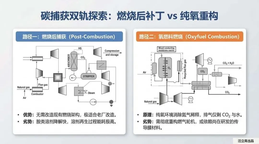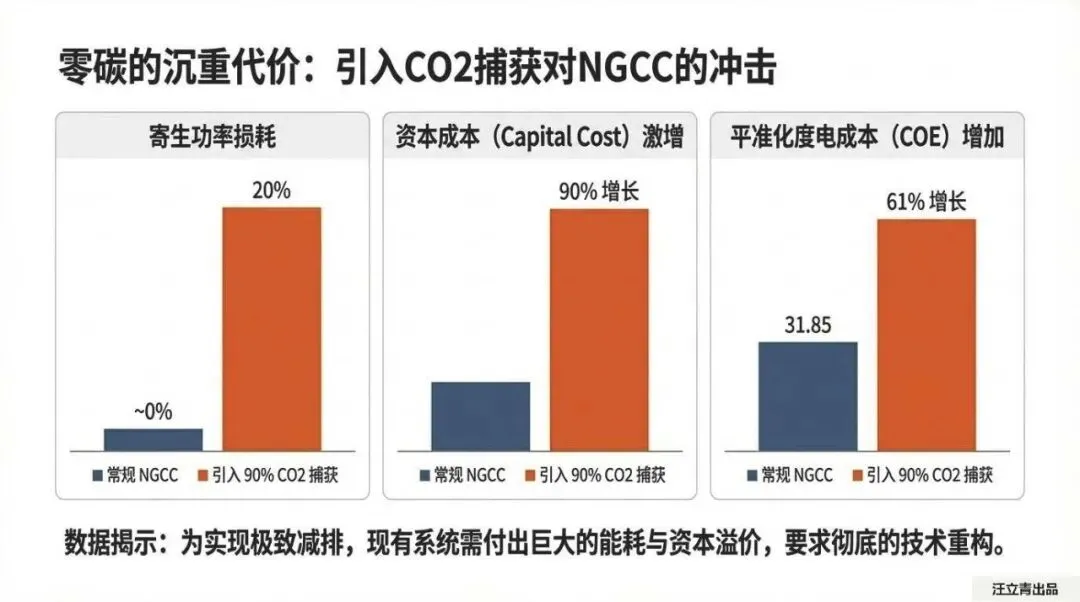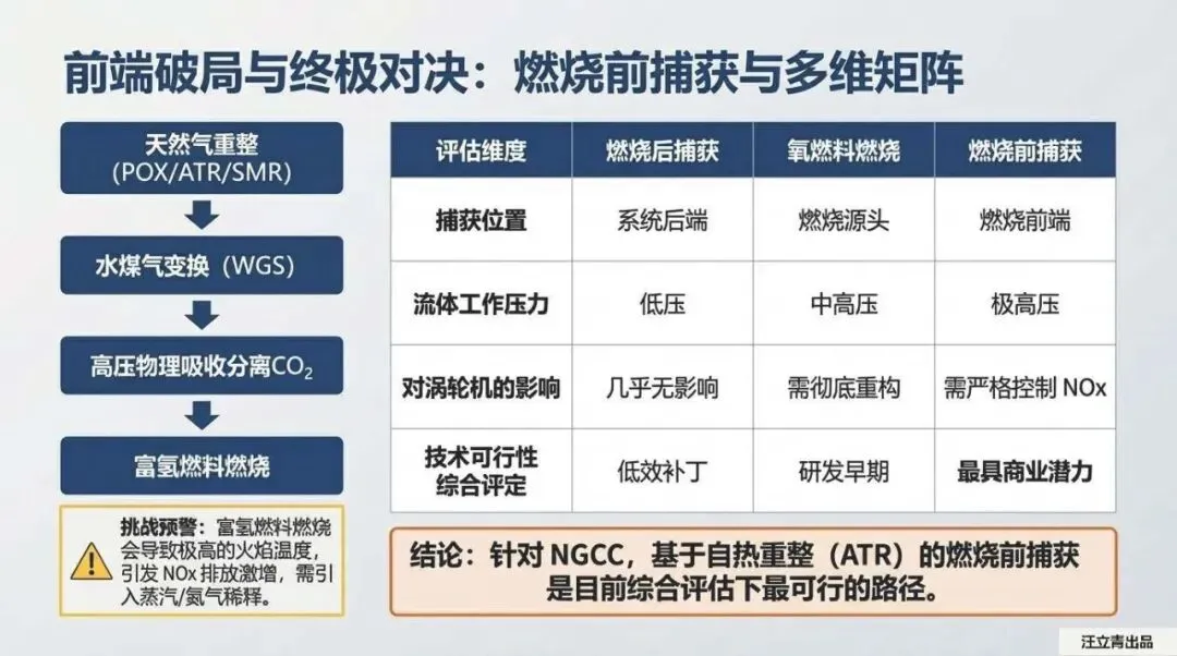 全球86%的化石能源基本盘短期内无法清退,真正的技术博弈锚定在化石燃料的高效与极致清洁化。常规天然气联合循环(NGCC)若强加90%碳捕集(CCS),系统将承受资本支出激增90%、度电成本(COE)暴涨61%的沉重代价。相比低效的燃烧后修补或处于研发早期的氧燃料重构,基于自热重整(ATR)的燃烧前捕获被确立为NGCC目前综合评估下最具商业潜力的破局路径。