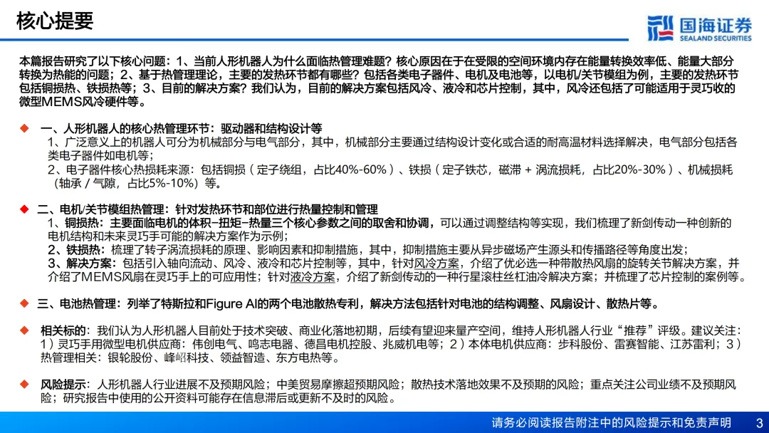 2026 年作为人形机器人量产元年,行业正迈入技术突破与商业化落地的关键阶段,而热管理难题成为其规模化发展的核心掣肘。国海证券 2026 年 3 月 11 日发布的研报,深度拆解了人形机器人散热核心痛点、解决方案及产业链投资标的,成为理解这一赛道的核心参考,而当前产业端的技术迭代、资本布局与政策支持,更让热管理赛道的发展机遇与挑战进一步凸显。