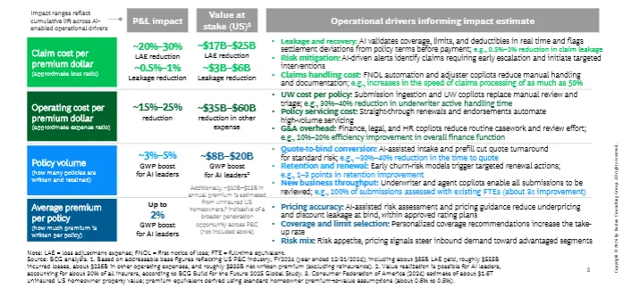 AI领先者GWP增长3%–5% 报价到出单转化率大幅提升,报价时间缩短30%–40% 续保留存提升1–3个点 精准定价减少低价承保与折扣漏损