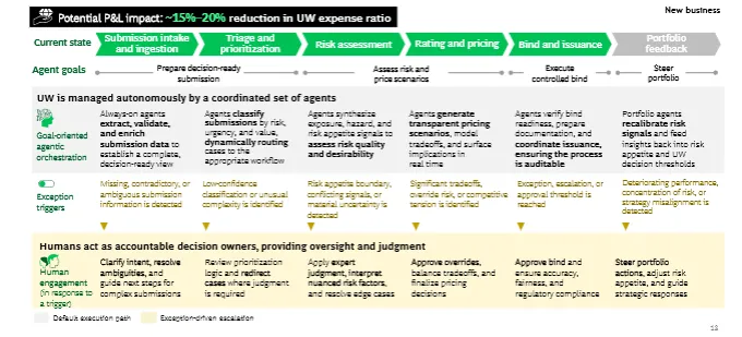 端到端重设计核保、理赔、分销 AI智能体主导,人只处理例外 → 真正改变成本、赔付、增长曲线