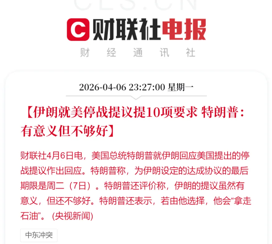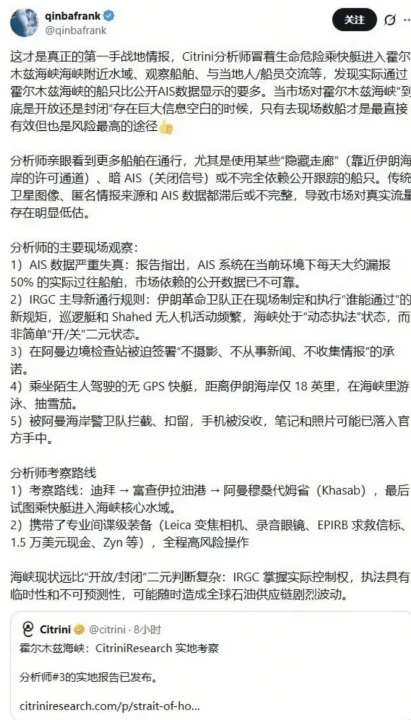这个周末,关于伊朗冲突是否停战的新闻此起彼伏。最新的资料显示,一位消息人士透露,美国和伊朗已收到关于停火协议的方案,该方案可能在6日生效。对此,伊朗方面表示:强调必须根据伊朗的关切实现永久结束战争;提出一系列诉求,如结束地区冲突、制定霍尔木兹海峡安全通行协议、战后重建以及解除制裁。特朗普回应称,为伊朗设定的达成协议的最后期限是周二(7日)。特朗普还评价称,伊朗的提议虽然有意义,但还不够好。特朗普还表示,若由他选择,他会“拿走石油”。受此消息影响,北京时间4月5日午后,纳指盘前一度涨超1%,但目前走势反反复复,原油再度走高,黄金走跌,说明市场依然在观望,且偏谨慎。对于何时停战,广发策略首席刘晨明此前曾发表研报,达拉斯联储的预测模型显示,至2026年二季度末,霍尔木兹海峡仍关闭概率还有58%;博彩网站KALSHI交易的结果也显示,霍尔木兹海峡在2026年7月之前通行的概率为63%。不过,随着冲突持续时间已超过1个月,市场对霍尔木兹海峡通航的关注程度更高,这直接代表着战事对全球能源真正的影响。就在此刻,总部位于纽约的独立主题投资研究机构Citrini Research战地研报彻底出圈。相较于以前分析师的二手消息或分析,该研报直接获取的是一手资料,跳过宏观叙事,回归现场,跳出信息茧房,得到当前霍尔木兹海峡真正的实况,可以得出更具投资价值的结论。根据市场消息,Citrini分析师冒着生命危险乘快艇进入霍尔木兹海峡附近水域,观察船舶、与当地人/船员交流。得出了一个反直觉的结论:实际通过霍尔木兹海峡的船只比公开AIS数据显得要多,无论局势如何发展,海峡的航运量将逐步上升;伊朗并不希望关闭霍尔木兹海峡。转自北落的师门,核心内容如下:1. 通航真相:霍尔木兹没有“关闭”,而是进入了“冲突持续+航运稳步回升”的新常态。2. 数据失真:公开AIS数据掩盖了50%的真实船量,实际通航量远比表面看到的要多。3. 航道变更:船只不再走公海主航道,而是90%穿行于伊朗领海的格什姆-拉腊克通道。4. 海上收费站:伊朗革命卫队掌握生杀大权,实行审批+收费+护航三位一体的通关模式。5. 中国特权:这一调研的关键隐线是——中国船只在该区域享有特殊的通行优先权,成本更低、障碍更少。6. 运费上行:绕行带来的航程增加+隐性保险成本,将导致全球运费长期隐性上涨。7. 霸权衰落:美国不再提供“免费保镖”,盟友纷纷绕开美国单独与伊朗沟通,多极化格局实证。8. 安全逻辑:只要经过伊朗审批报备,安全性可控;最大的风险来自未报备的擦枪走火。9. 油价预测:极端暴涨概率低,但地缘溢价将成为常态,油价易受突发事件冲击。10. 投资机会:油运、航运保险板块将直接受益于这种变局,而原油价格将维持高位震荡。一、核心结论