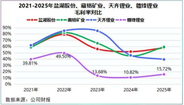 毛利率的差异更是两极分化,2021-2025年,天齐锂业、藏格矿业、盐湖股份年均毛利率均在60%以上,赣锋锂业不到三者的一半。
