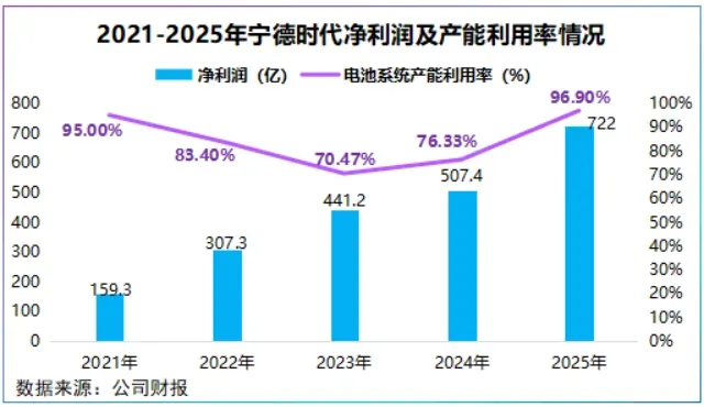 2025年,宁德时代赚了722亿元,平均每天净赚1.98亿元,而这归功于产能利用率的提升,2025年全年高达96.9%,单位固定成本被大幅摊薄。