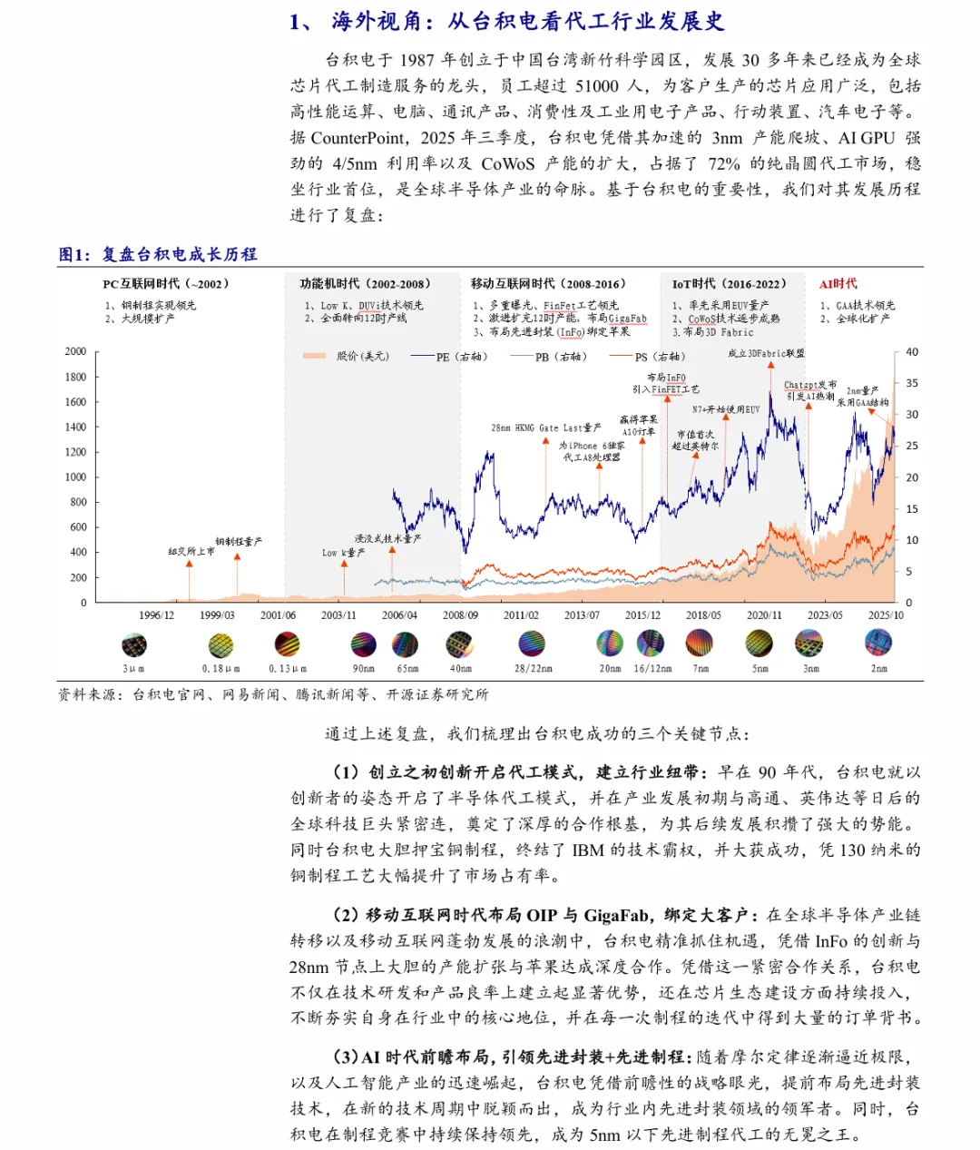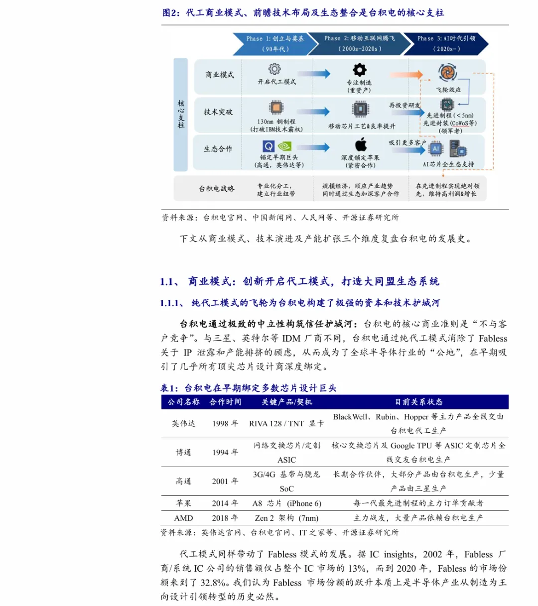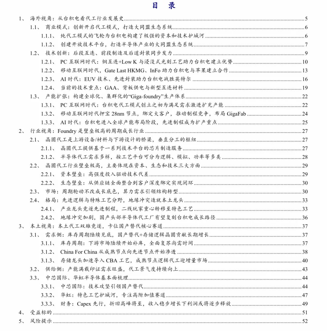 摘要:晶圆代工是兼具高资本与生态壁垒的周期成长赛道,台积电的发展历程验证了生态-技术-产能-订单的飞轮成长法则,当前地缘博弈、AI需求与政策红利推动全球代工格局加速重构。本土代工龙头已完成技术与产能铺垫,短期迎来盈利修复,中长期国产替代与工艺创新打开广阔空间,有望复刻台积电的成长路径。本报告复盘台积电发展史,梳理本土晶圆代工的战略机遇,为投资者与半导体行业从业者提供决策参考。