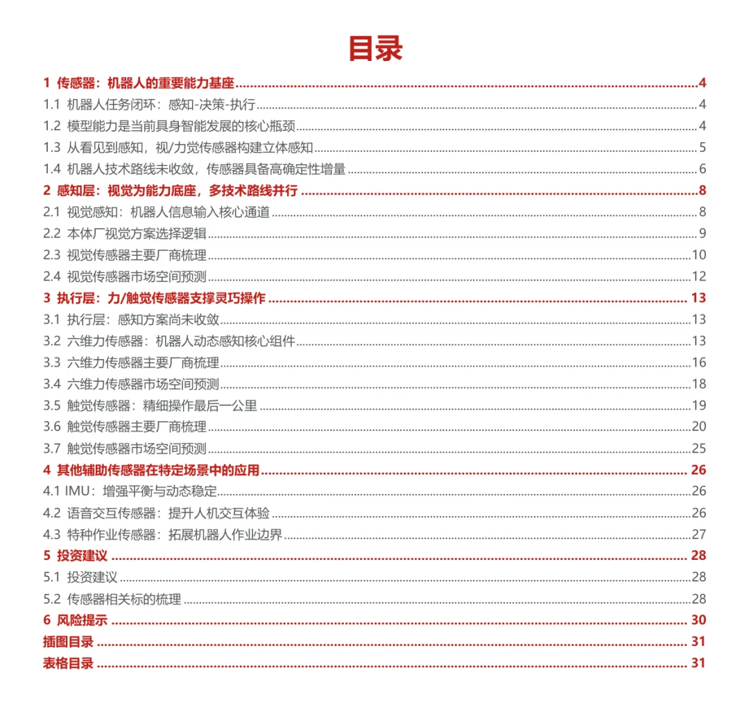 摘要:随着人形机器人产业加速发展,作为机器人感知核心的传感器迎来高速增长,全球机器人传感器市场规模预计从2026年的28亿美元增长至2036年的79亿美元。其中六维力传感器2025年国内人形机器人领域出货量达1.23万台,同比增长510%,2030年国内市场规模将超18亿元;触觉传感器国产化加速,2027年国产化率有望达41%。本报告梳理了人形机器人传感器的发展现状、市场规模、技术迭代与竞争格局,分析了相关企业的布局进展,为投资者与机器人行业从业者提供决策参考。