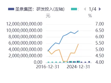 研发投入持续增长,技术创新显著提升。圣泉集团在2024年的研发投入显著增加,达到5.44亿元,同比增长25.80%,研发费用率首次突破5%[1][16]。这一增长反映了公司在产品研发上的重视和投入。从2019年至2024年,公司三大费用率呈现稳步下降趋势,由13.22%降至7.73%[1]。圣泉集团的子公司涵盖树脂及复材、铸造材料、生物质化工、新能源等领域,各子公司权责分明,为公司的研发和创新提供了有力支持[1]。2024年,公司实现了显著的业绩增长,全年营业收入达到100.20亿元,同比增长9.87%[22]。公司在高性能材料研发方面取得了重要进展,包括核电高温气冷堆燃料元件用核纯树脂、大飞机刹车片用浸渍树脂的商业化应用,以及罐体用涂料酚醛、新能源汽车专用树脂、油田领域特种树脂等定制化产品的研发突破[22]。这些研发投入和成果不仅提升了圣泉集团的品牌价值,也为其在生物制造与化学新材料领域的领先地位奠定了坚实基础。
