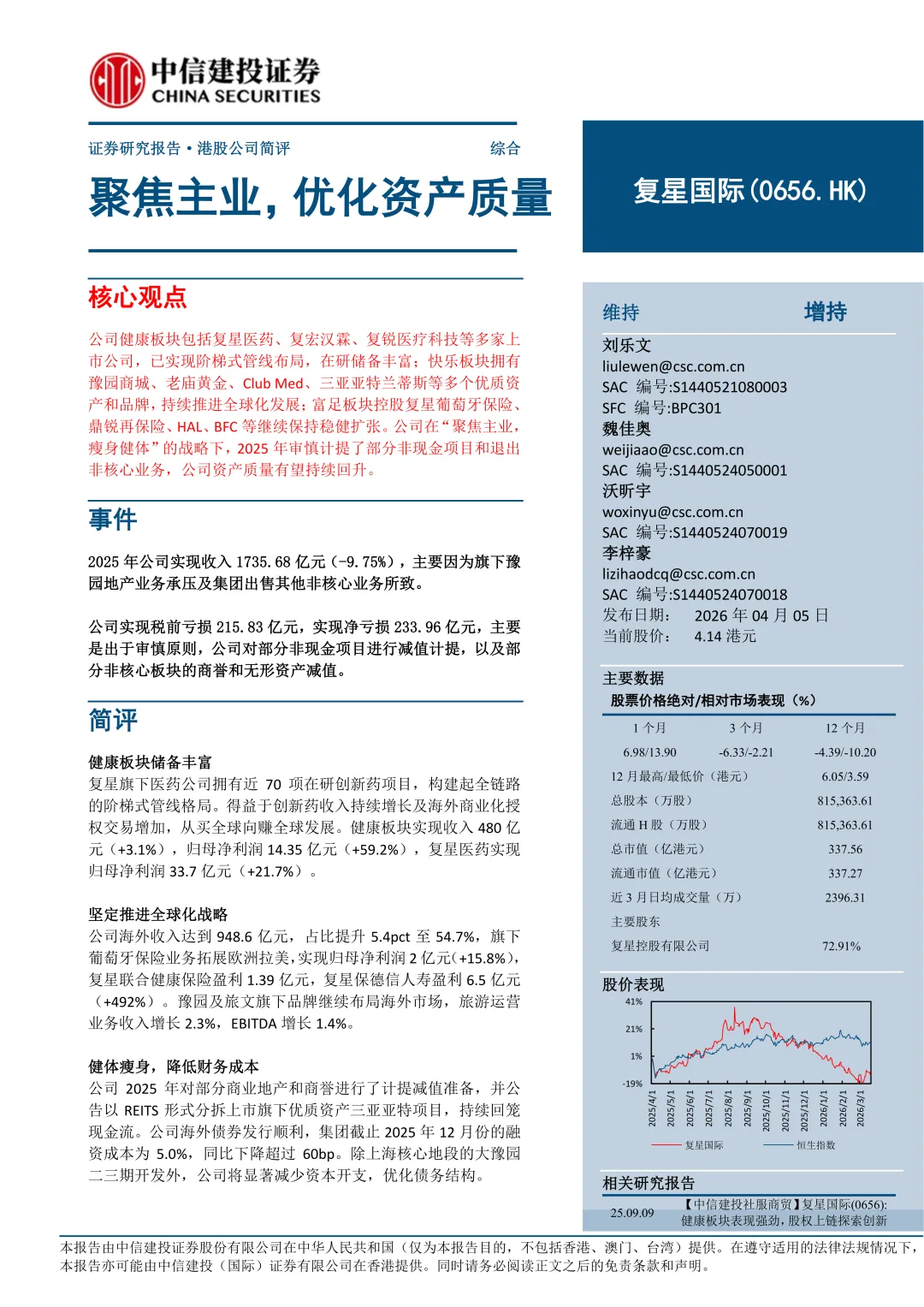 健康板块储备丰富:复星旗下医药公司拥有近70 项在研创新药项目, 构建起全链路的阶梯式管线格局。得益于创新药收入持续增长及海外商业化授权交易增加,从买全球向赚全球发展。健康板块实现收入 480 亿元(+3.1%),归母净利润 14.35 亿元(+59.2%),复星医药实现归母净利润 33.7 亿元(+21.7%)。坚定推进全球化战略:公司海外收入达到 948.6亿元,占比提升5.4pct至54.7%,旗下葡萄牙保险业务拓展欧洲拉美,实现归母净利润2 亿元(+15.8%),复星联合健康保险盈利1.39亿元,复星保德信人寿盈利6.5亿元(+492%)。豫园及旅文旗下品牌继续布局海外市场,旅游运营业务收入增长2.3%,EBITDA增长1.4%。健体瘦身, 降低财务成本:公司2025年对部分商业地产和商誉进行了计提减值准备,并公告以REITS 形式分拆上市旗下优质资产三亚亚特项目,持续回笼现金流。公司海外债券发行顺利,集团截止 2025 年 12 月份的融资成本为5.0%, 同比下降超过60bp 。除上海核心地段的大豫园二三期开发外, 公司将显著减少资本开支, 优化债务结构。投资建议:公司在健康、快乐、保险板块主业保持较好成长,在2025年进行非现金项目减值计提后,有望加速非核心业务的退出,提升资产质量。我们更新2026-2028 年归母净利润分别为16.66 亿元/23.85 亿元/29.85 亿元,公司目前PB 仅0.36 倍,维持“增持”评级。