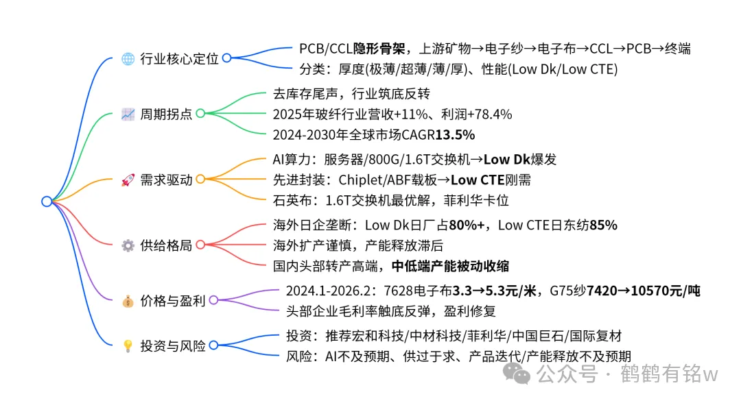 电子玻纤布作为PCB/覆铜板核心基材,行业已去库存见底,在AI算力基建与先进封装双轮驱动下,Low Dk低介电、Low CTE低热膨胀高端电子布需求爆发;海外大厂扩产谨慎、国内头部企业转产高端引发产能挤兑,供需错配推动行业价格与盈利上行,开启新一轮高景气周期,国产替代空间广阔,重点关注宏和科技、中材科技、菲利华、中国巨石、国际复材等企业。