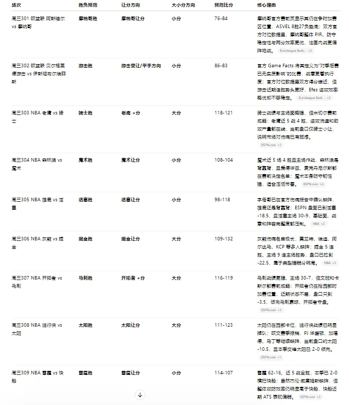 基础面:掘金 51-28、主场 26-13,灰熊 25-54、客场 11-26。数据面:掘金场均 121.8 分,灰熊失分高达 120.0;掘金近 5 场全胜,连续高得分。伤病面:灰熊这边莫兰特、阿尔达马、埃迪、GG Jackson、Cam Spencer、KCP 等多人缺阵或高概率缺阵,阵容已经接近“发展联盟化”;掘金只缺边角轮换。盘口热度:Covers 和 ESPN 都给到掘金 -22.5、总分约244.5。这种盘能开到 20+,本身就是伤病和战力断层的直接体现。结论:看好掘金大胜并穿盘,总分我略偏大分,因为灰熊防守残破、掘金近来进攻过热。