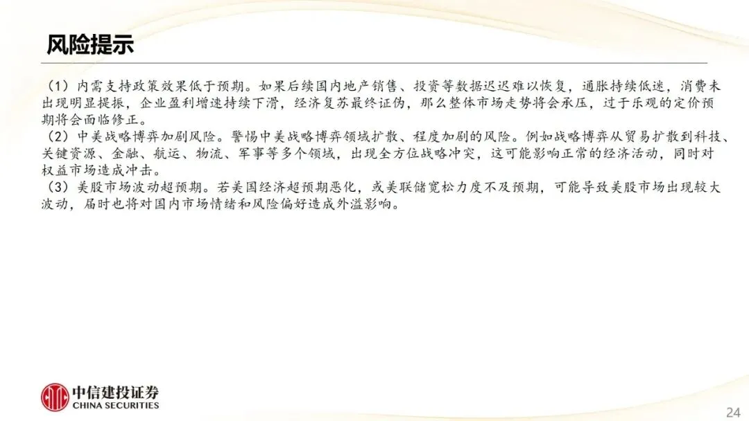 风险提示(1)内需支持政策效果低于预期。如果后续国内地产销售、投资等数据迟迟难以恢复,通胀持续低迷,消费未出现明显提振,企业盈利增速持续下滑,那么整体市场走势将会承压,过于乐观的定价预期将会面临修正。