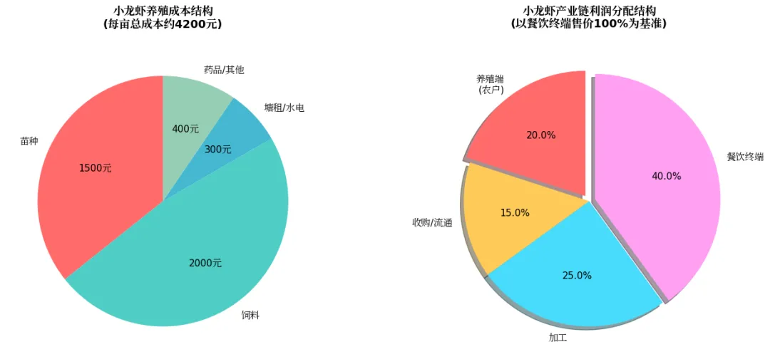 - 价格周期: 明显的”W”型季节性波动,2月春节高点(40+元/斤)→5-6月夏季谷底(15元/斤)→8月次高点→11月回升,全年价差可达3倍 - 餐饮端: 全国约4万多家小龙虾专业门店,餐饮产值超3000亿元,但2024年闭店率上升45%,头部品牌开始自建养殖基地锁定货源 - 利润分配: 养殖端仅占产业链利润的20%,餐饮终端占据40%,加工环节25%,流通环节15%。