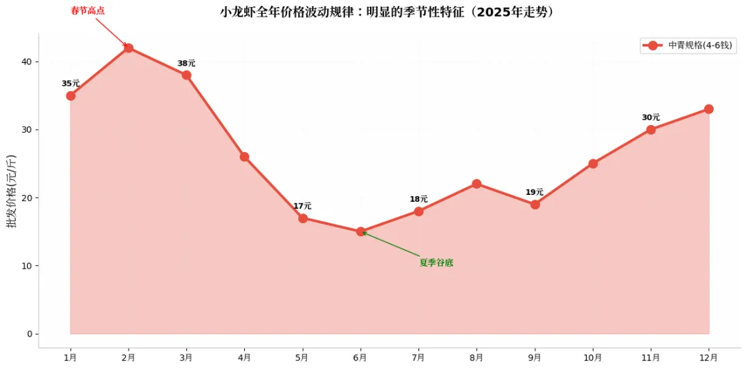 价格周期特征: - 2月春节高点: 供应短缺,中青规格可达40-50元/斤 - 5-6月夏季谷底: 稻田虾集中上市,中青跌至12-17元/斤,较高点跌60-70% - 8月次高点: 高温导致产量减少,价格回升至20-25元/斤 - 11月回升: 秋苗投放,捕捞减少,价格再次上涨。