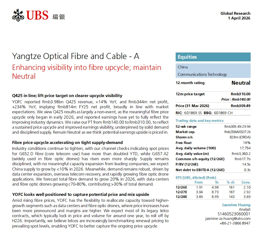 瑞银将长飞光纤A股目标价由140元大幅上调至310元,对应2027年预测市盈率35倍,隐含H股约15%的折价。尽管如此,瑞银仍维持“中性”评级,认为当前股价已基本反映了上行周期的预期。