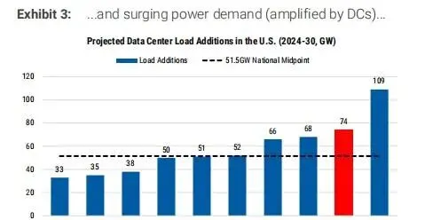 数据中心需求是这轮周期的加速器。摩根士丹利测算:全球数据中心用电需求到2030年年均增长23%,美国更高,达到26%。2025–2028年,美国将新增约74GW数据中心电力需求。但关键不在"用电多",而在"用电复杂":数据中心需要稳定电力、高质量供电、高密度接入。这些全部指向一个结果:电网必须升级,变压器必须跟上。