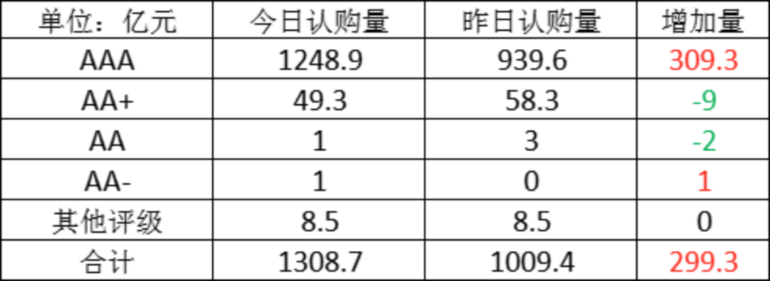今日存单认购量规模1308.7亿元,较上一工作日认购量有所增加,增加了299.3亿元。