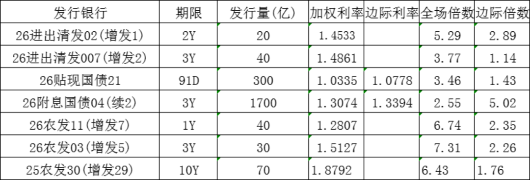 今日农业发展银行发行1年政策性金融债,发行量40亿元,发行利率1.2807%,投标倍数6.74倍,边际倍数2.35倍;农业发展银行发行3年政策性金融债,发行量30亿元,发行利率1.5127%,投标倍数7.31倍,边际倍数2.26倍;农业发展银行发行10年政策性金融债,发行量70亿元,发行利率1.8792%,投标倍数6.43倍,边际倍数1.76倍。