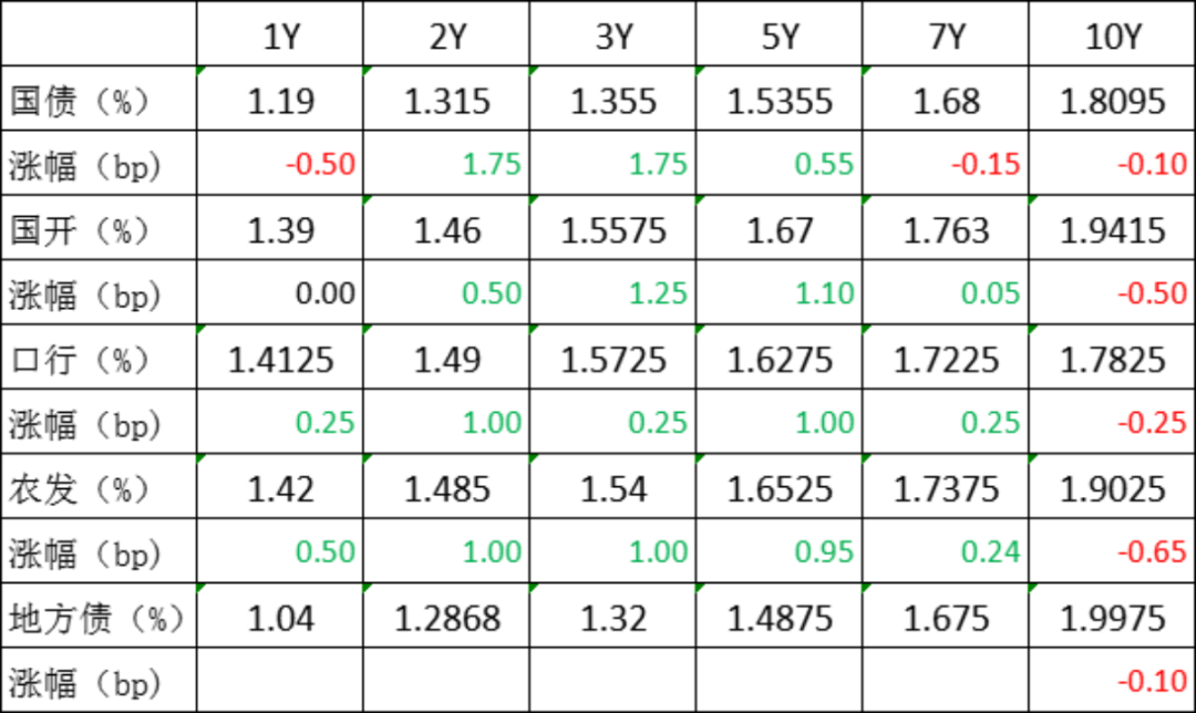 截止17:10,利率债二级市场中,利率成交价格总体呈上涨趋势,其中上涨程度较大的有2年期国债,收益率上涨1.75bp,报1.315%;3年期国债,收益率上涨1.75bp,报1.355%;3年期国开债,收益率上涨1.25bp,报1.5575%,5年期国开债,收益率上涨1.1bp,报1.67%。