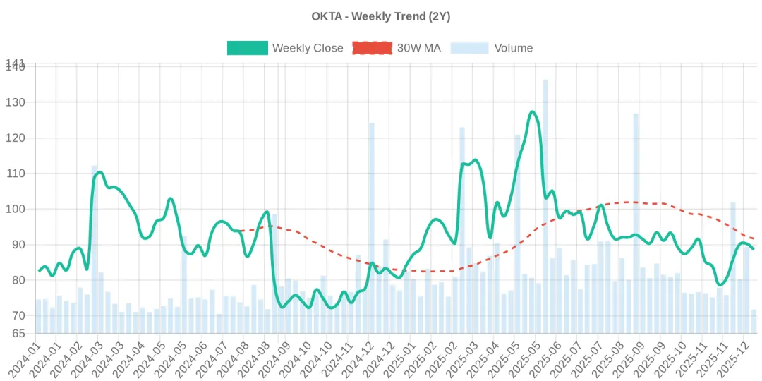 企业行动提示:近期未检测到任何拆股除权事件。所有的价格波动和技术跳空均反映了真实的市场动态和情绪变化。从长达四年的周线结构来看,OKTA自2022年初超$200的高点经历了残酷的第四阶段(Stage 4)暴跌。此后,股价一直处于漫长且高波动的第一阶段(Stage 1)筑底期。尽管曾多次尝试突破(尤其是在2025年中期触及$127附近),但股价始终无法维持动能,多次遭遇剧烈的均值回归,重新跌回多年的底部区间。生命线状态:目前股价为 $78.12,明确运行在关键的30周移动平均线($91.71)下方,动能持续偏向负面。前期突破的失败表明,当前仍缺乏机构资金的实质性吸筹。关键点位:支撑位 $69.50(2026年Q1近期低点) | 阻力位 $91.71(30周均线 / 动态供给区)