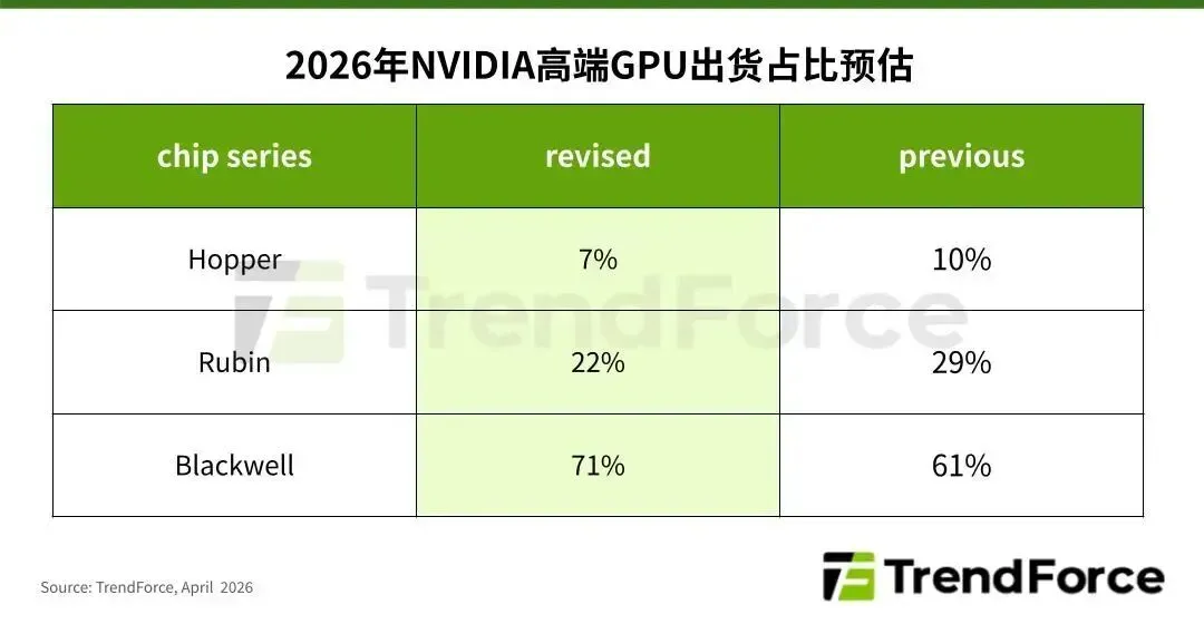 根据TrendForce集邦咨询最新AI Server产业调查,2026年NVIDIA(英伟达)的高端AI芯片出货结构将出现变化,受到国际形势变化、供应链仍需时间调校等因素影响,预估Hopper、Rubin系列占其整体高端GPU出货比例将下降,进而推升Blackwell系列占比从61%大幅成长至71%,主导市场的地位更加巩固。