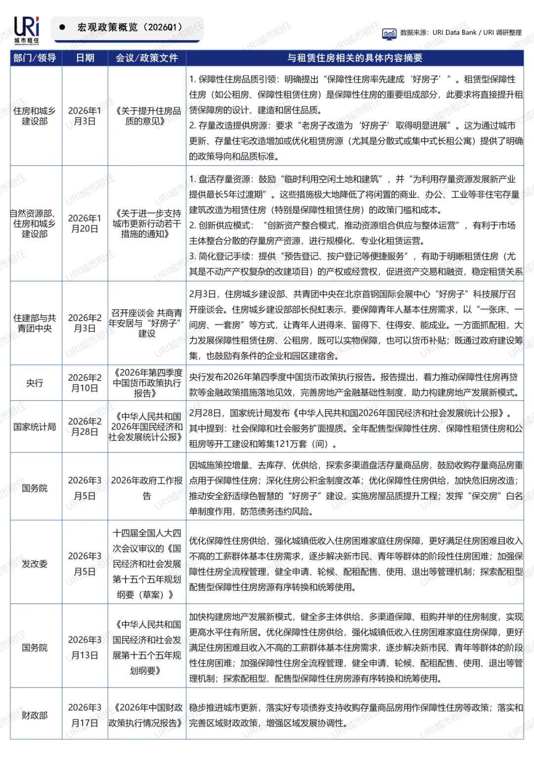 2026年一季度,国家多部门密集出台租赁住房相关政策。住建部与自然资源部聚焦“好房子”建设和城市更新,推动存量改造与品质提升;央行、财政部强化金融与财政支持,推动保障房再贷款和专项债落地;政府工作报告和“十五五”规划纲要明确优化保障性住房供给,健全全流程管理机制,探索房源有序转换。