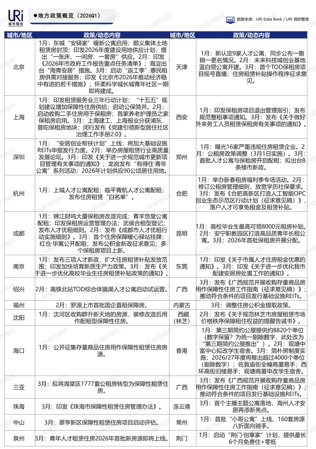 2026年一季度,全国超20个城市及地区密集出台租赁住房相关政策,呈现三大特点:一是存量盘活成为主流,上海、三亚、香港等多地推动收购存量房、改造酒店及商厦为保租房或学生公寓;二是人才安居精准发力,北京、深圳、成都、合肥等地推出人才公寓、青年驿站及租房补贴;三是制度规范持续完善,天津、西安、郑州等地优化公租房、保租房管理流程。