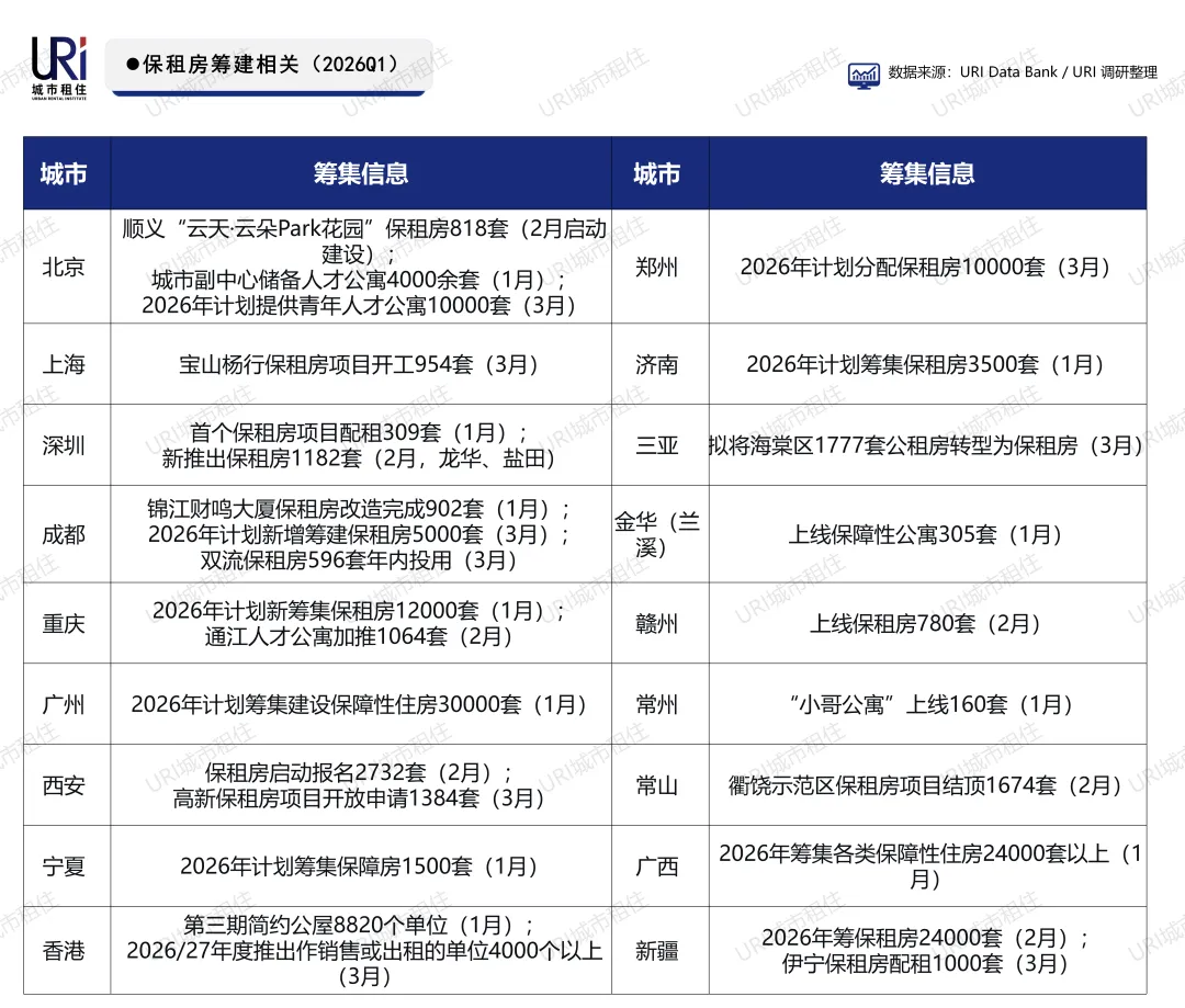 2026年一季度,多地密集公布保障性住房筹集计划,总量超15万套(间)。广州以3万套居首,重庆、新疆、广西分别计划筹集1.2万套、2.4万套和2.4万套以上。北京、深圳、成都等城市同步推进项目开工与房源配租,香港亦推出逾万套简约公屋。各地通过新建、改造、收购等多种方式加速保租房供应,助力新市民、青年人等群体安居。