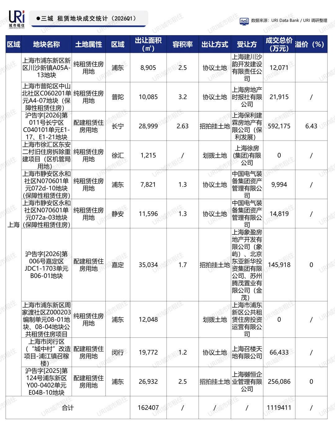 2026年第一季度,上海共成交10宗租赁住房用地,总出让面积约16.2万平方米,成交总价超111亿元,供应活跃。其中长宁区地块由保利发展以59.2亿元摘得(溢价6.43%),多宗纯租赁用地由国企协议或划拨取得,呈现“国企保基本、市场补高端”格局。同期,北京、杭州无租赁住房用地成交,市场热度集中于上海。