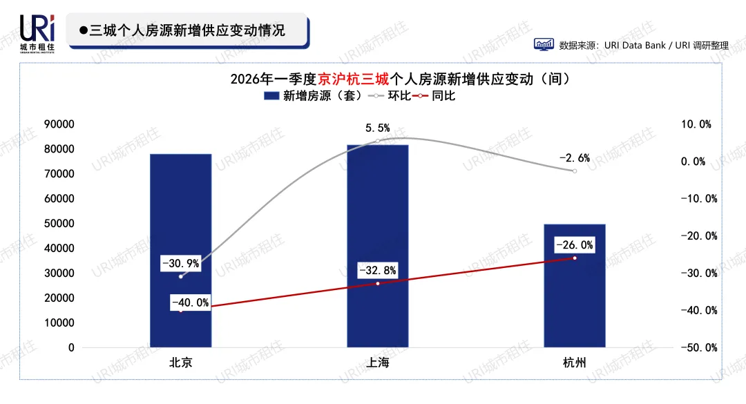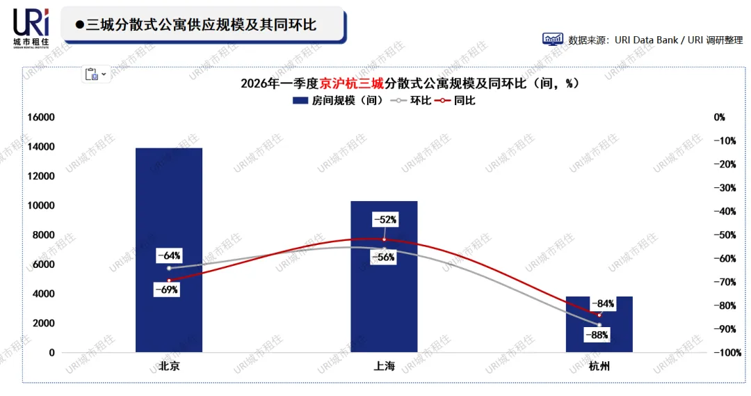 2026年一季度,三城分散式公寓新增房间规模全线暴跌,同环比降幅均在50%以上,杭州同比更是锐减84%,市场供应急剧萎缩。具体数量上,杭州仅新增3805间,北京新增1.39万间,仍为三城最高。