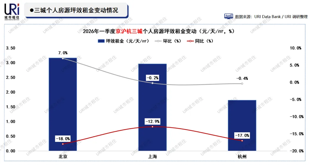 2026年一季度,三城个人房源租金同比仍全面下降,北京、上海、杭州分别下跌18.0%、12.9%、17.0%,市场持续承压。环比方面,北京租金上涨7.0%至3.16元/天/㎡,表现显著回暖;上海、杭州则微降0.2%和0.4%,基本持平。北京租金反弹或与供应收缩、需求阶段性释放有关,而沪杭仍处温和调整通道。