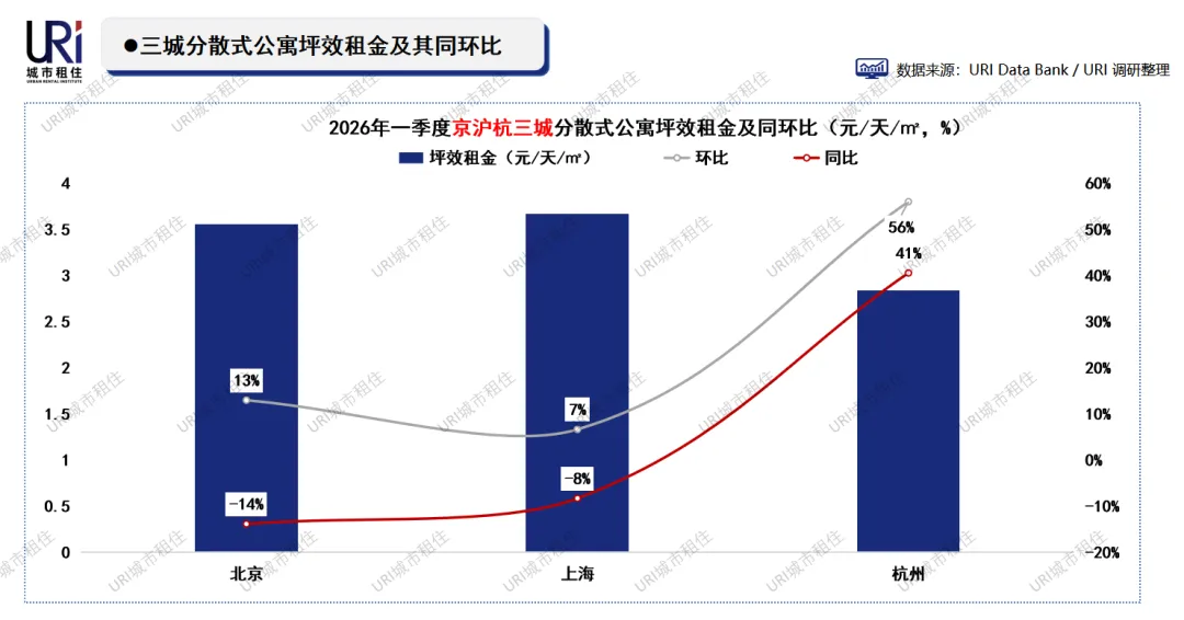 2026年一季度,三城分散式公寓租金环比均实现上涨,其中杭州涨幅高达56%,租金升至2.84元/天/㎡;北京、上海分别上涨13%和7%,租金达3.56元/天/㎡和3.67元/天/㎡。同比来看,北京、上海仍分别下跌14%和8%,而杭州同比大涨41%,呈现独立行情。杭州租金异动主要受供应断崖式收缩(同比-84%)影响,供需失衡推高价格。