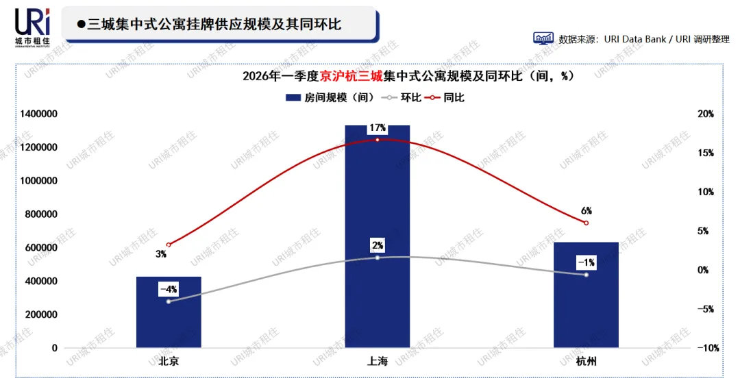 2026年一季度末,三城集中式公寓房间总规模约238.8万间,整体保持平稳增长。上海以133.2万间居首,环比增长2%、同比增长17%,增幅显著;北京规模42.5万间,环比微降4%、同比增长3%,基本持平;杭州63.3万间,环比下降1%、同比增长6%,稳中有升。