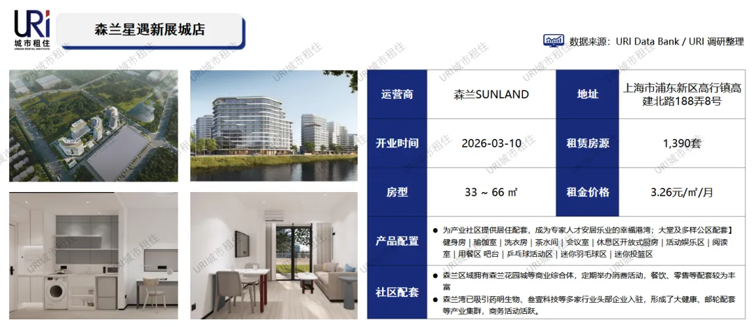 森兰星遇·新展城店位于上海浦东新区金京路俱进路东南侧,是新展城重点项目。项目包含3栋公寓,总建筑面积约9.2万平方米,可提供1390套多房型房源。作为外高桥集团“森兰”品牌旗下“舒适型”产品线,项目专为青年人才打造,社区配备共享健身房、洗衣房、阅读室等公共空间。