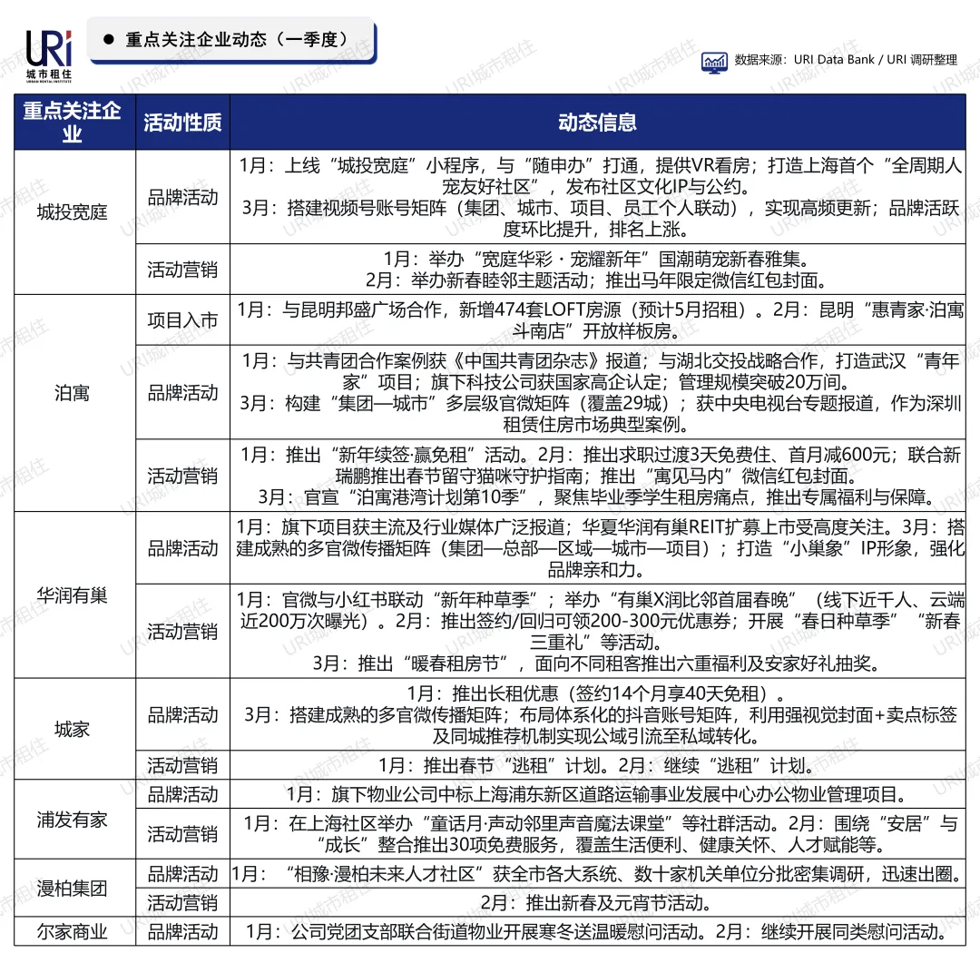 2026年第一季度,主要集中式公寓品牌在数字化服务、社群活动及政企合作上持续加码。城投宽庭上线小程序并打通“随申办”,打造人宠友好社区;泊寓管理规模突破20万间,获央视报道;华润有巢举办首届春晚并推出“暖春租房节”;城家布局抖音矩阵实现精准引流;浦发有家整合30项免费服务;漫柏集团人才社区引发关注。