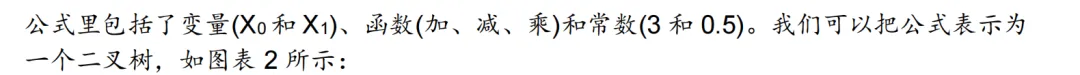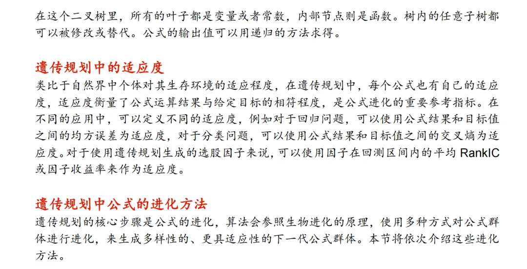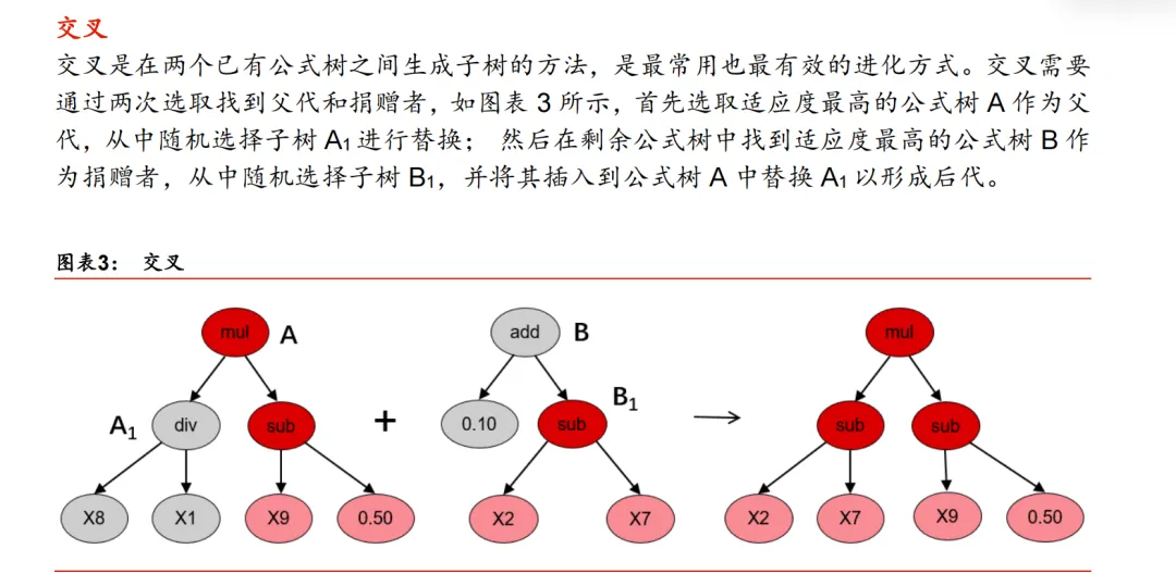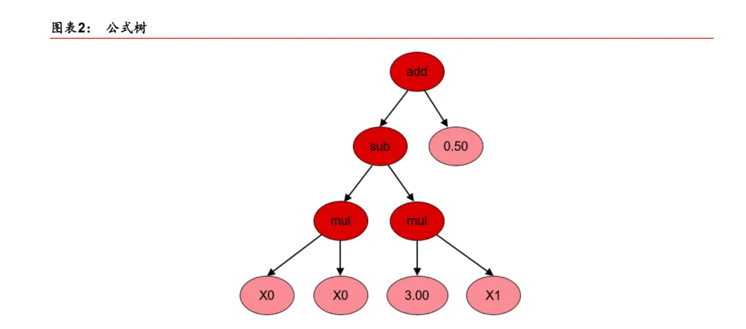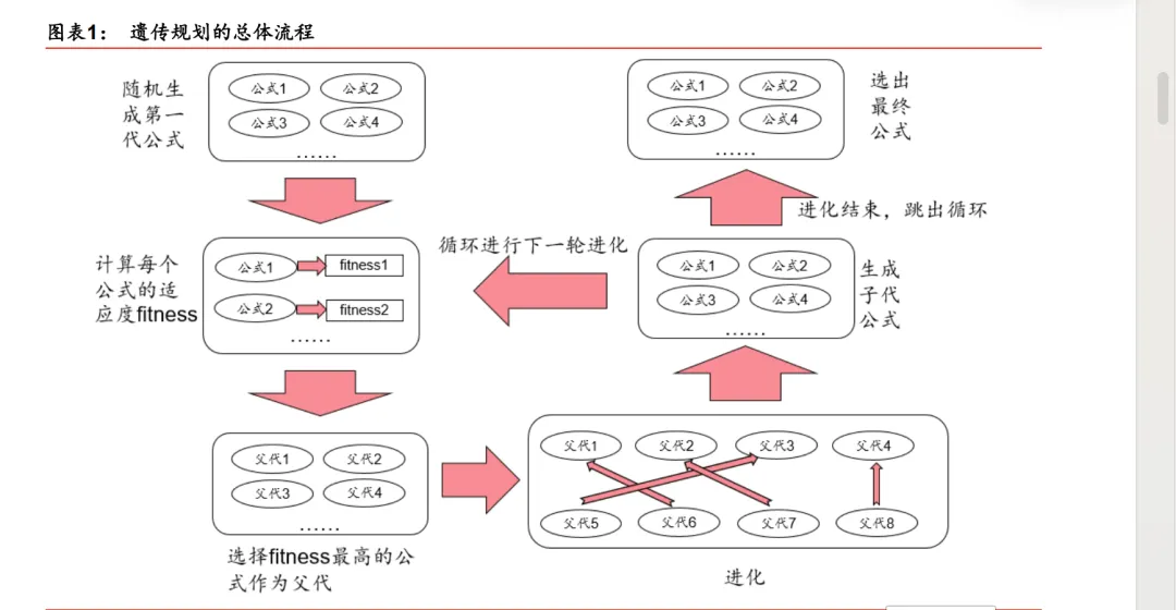 图表 1 展示了遗传规划的总体流程。一开始,一组未经选择和进化的原始公式会被随机生成(第一代公式),通过某种规则计算每个公式的适应度,从中选出适合的个体作为下一代进化的父代。这些被选择出来的父代通过多种方法进化,形成不同的后代公式,然后循环进行下一轮进