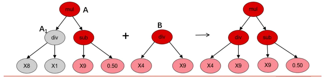 子树变异是一种激进的变异操作,父代公式树的子树可以被完全随机生成的子树所取代。这可以将已被淘汰的公式重新引入公式种群,以维持公式多样性。如图表 4 所示,子树变异选择适应度最高的公式树 A 作为父代,从中随机选择子树 A1进行替换,然后随机生成用以替代的子树 B,并将其插入到公式树 A 中以形成后代