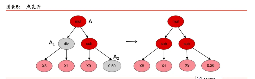 点变异是另一种常见的变异形式。与子树变异一样,它也可以将已淘汰的公式重新引入种群中以维持公式多样性。如图表 5 所示,点变异选取适应度高的父代公式树 A,并从中随机选择节点和叶子进行替换。叶子 A2被其他叶子替换,并且某一节点 A1 上的公式被与其含有相同参数个数的公式所替换,以此形成后代
