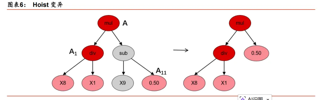Hoist(提升)变异是一种对抗公式树过于复杂的方法。这种变异的目的是从公式树中移除部分叶子或者节点,以精简公式树。如图表 6 所示,Hoist 变异选取适应度高的父代公式树A 并从中随机选择子树 A1。然后从该子树中随机选取子树 A11,并将其“提升”到原来子树 A1 的位置,以此形成后代