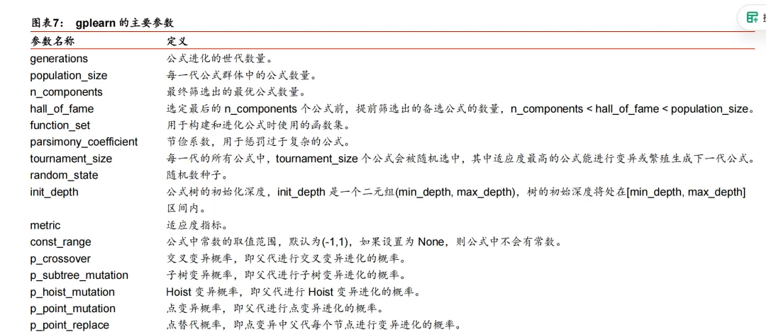 gplearn 的简介和关键参数说明gplearn(https://gplearn.readthedocs.io)是目前最成熟的 Python 遗传规划项目之一。gplearn 提供类似于 scikit-learn 的调用方式,并通过设置多个参数来完成特定功能。图表7 展示了 gplearn 的主要参数