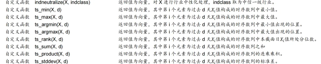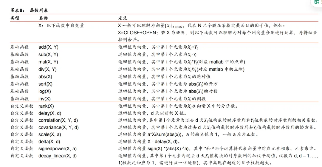 gplearn 提供了一套简洁、规范的遗传规划实现代码,但是不能直接运用于选股因子的挖掘。我们从源代码的层面,对 gplearn 进行了深度改进,使得其能运用于选股因子的挖掘。首先,我们扩充了 gplearn 的函数集(function_set),提供了更多特征计算方法,以提升其因子挖掘能力。除了 gplearn 提供的基础函数集(加、减、乘、除、开方、取对数、绝对值等),我们还自定义了一些函数(包括多种时间序列运算函数,这是 gplearn 不支持的),函数列表详细展示在图表 8 中。其次,我们改进了 gplearn 使得其能进行单因子测试。在测试过程中,还可以对待挖掘因子进行传统风格因子中性化。另外,遗传规划由于涉及到大量的随机操作,时间开销较大,我们还使用了 Python 中的并行运算技术,加快了因子矩阵的运算速度,缩短了因子挖掘时间