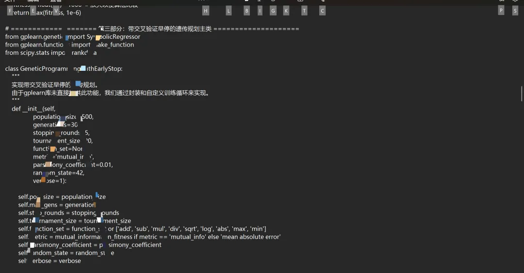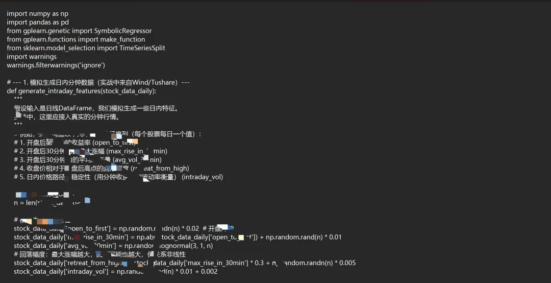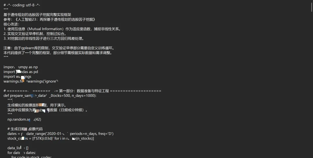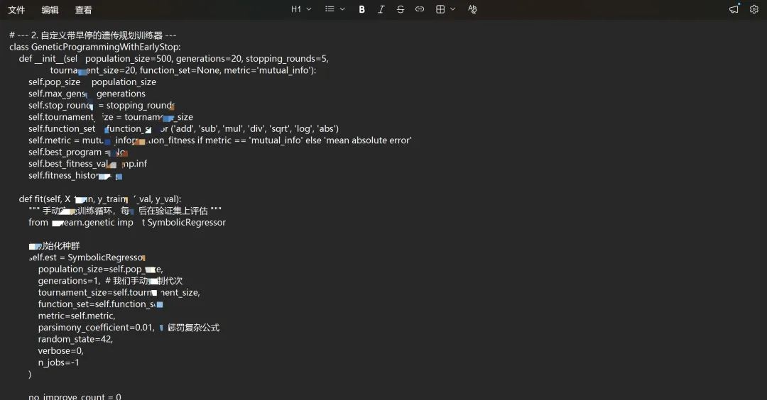 过拟合控制机制:我们设计了GeneticProgrammingWithEarlyStop类(尽管是示意),其核心思想是每代在独立验证集上评估,并实施早停。这直接对应研报中“在gplearn中引入交叉验证”的改进,确保挖掘出的因子具有泛化能力。