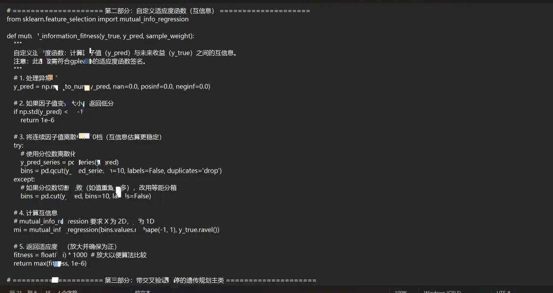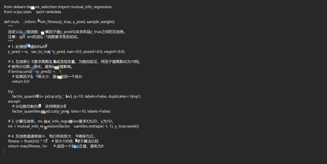 研报强调使用互信息(Mutual Information, MI) 替代线性IC。我们需要自定义适应度函数。