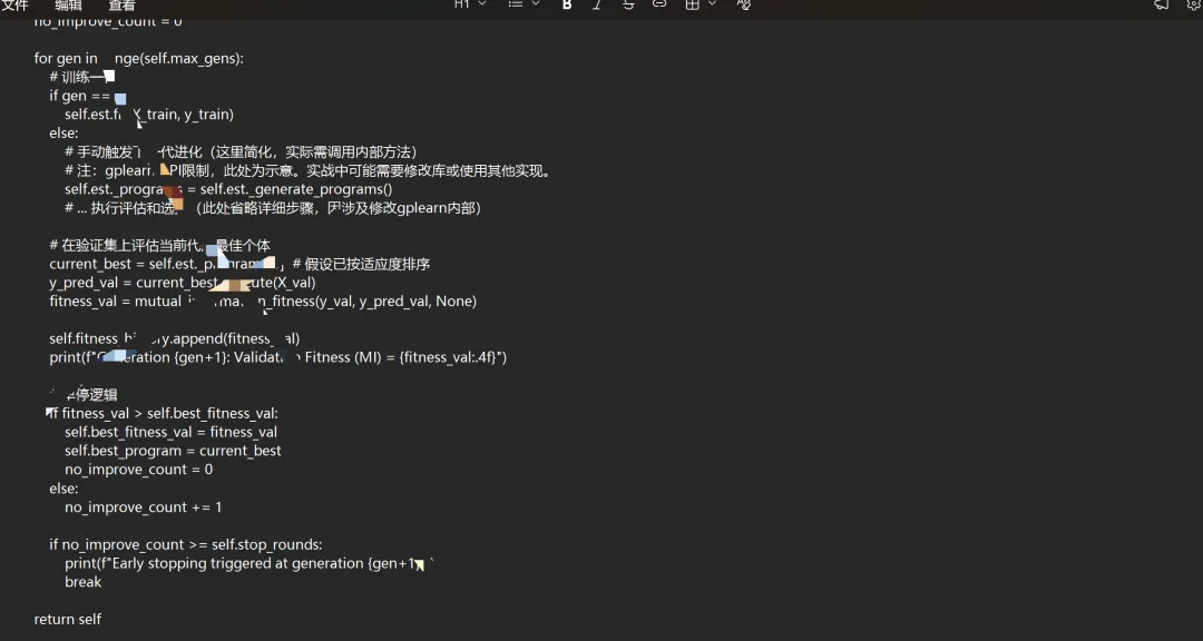 标准gplearn不支持验证集早停。我们需要手动控制训练循环。