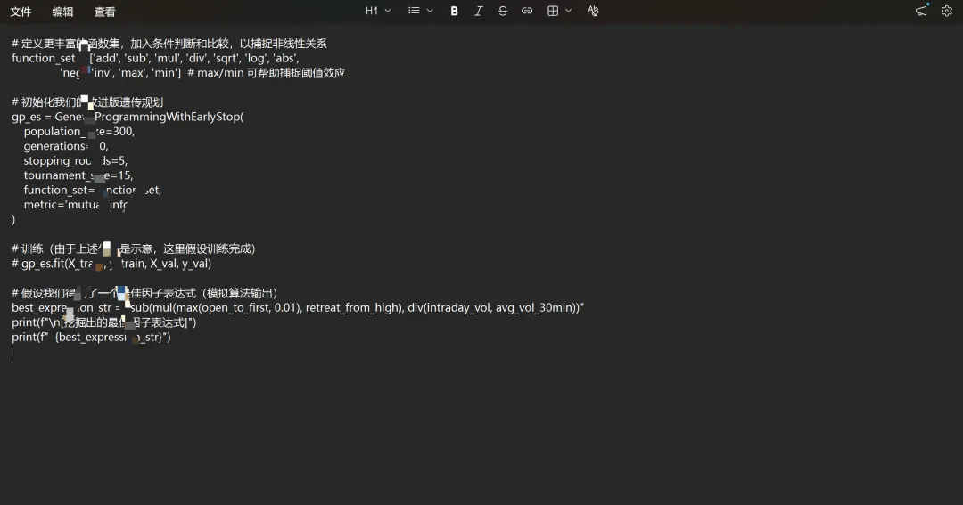 适应度函数的革新:我们抛弃了传统的'mean absolute error',实现了mutual_information_fitness函数。这使得算法在进化时,以最大化因子与收益间的非线性依赖关系为目标,从而能发现像max(open_to_first, 0.01)这样的阈值型非线性结构。